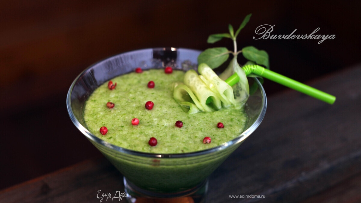 Очень полезный и вкусный питьевой салатик. Измельченный огурец является очень ценным диетическим и лечебным средством, поскольку содержит очень маленькое количество жиров, белков и углеводов, но при этом оказывает омолаживающее и оздоровительное действие. Дыня улучшает здоровье и настроение, омолаживает кожу и разглаживает морщины, укрепляет ногти и волосы. Готовится очень просто и быстро – идеальный завтрак на скорую руку.
