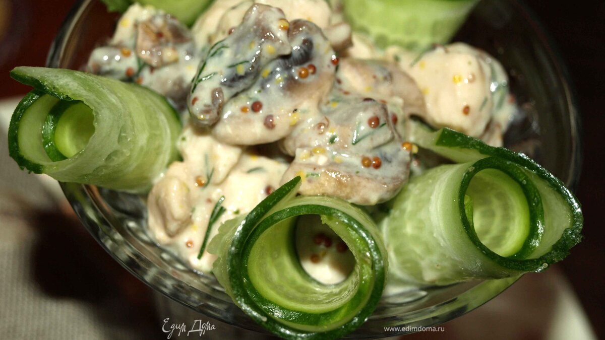 Коктейль из куриной грудки, шампиньонов и огурцов