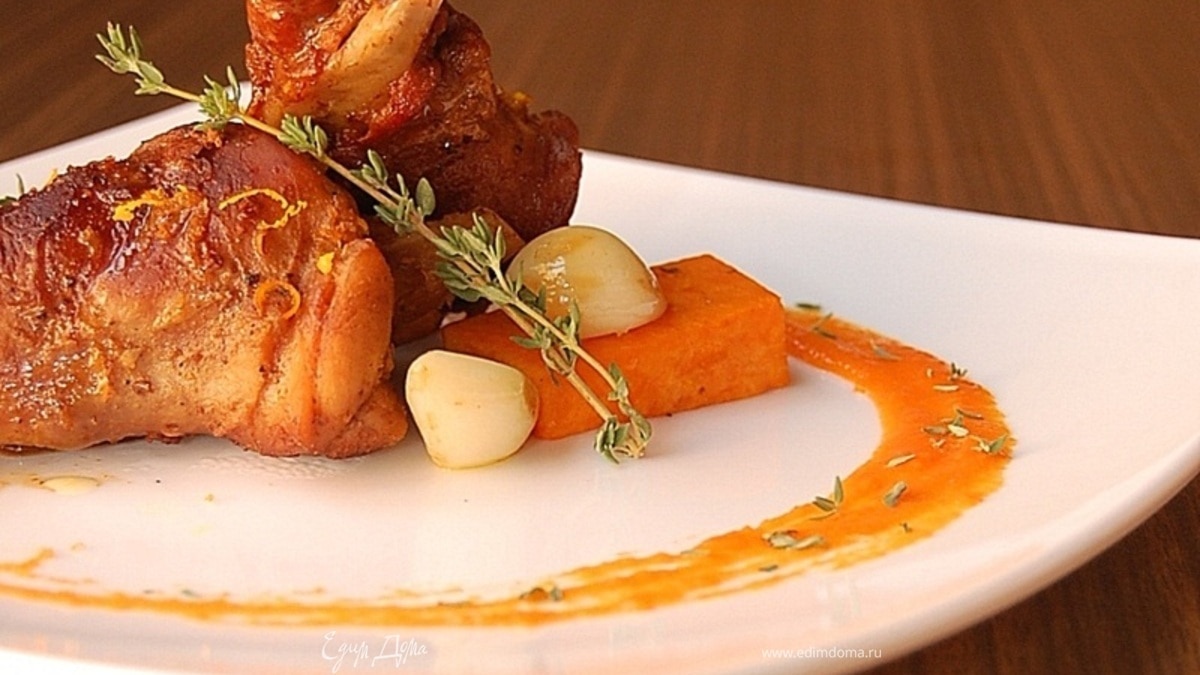 Для декора тарелки несколько кусочков запеченной тыквы я протерла через сито +капельку оливкового масла + соль и перец. Декорировать тарелку протертой тыквой, рядом выложить кролика и запеченную тыкву. Полейте мясо соусом, в котором оно запекалось.