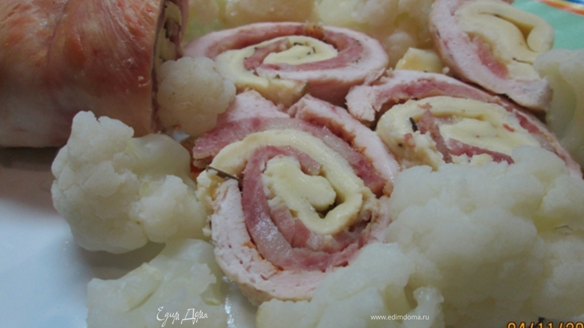 Готовые рулеты смазать растопленным сливочным маслом. Поставить под гриль на расстоянии 12 см от горелки на 10 мин. Цветную капусту отварить. Нарезать рулет ломтиками и подавать! Приятного аппетита!