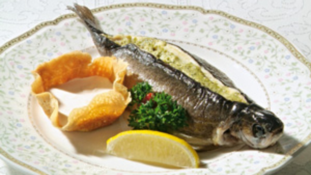 - Шаг 1Очистите рыбу от чешуи, сделайте надрез на спине и удалите косточки, внутренности, глаза и жабры. Приготовьте начинку. Разомните половину порции творога, влейте 75 г сливок, добавьте измельченные шпинат и лосось, посолите, поперчите и размешайте до образования однородной массы. Начините смесью рыбу, смажьте растительным маслом, выложите на противень, поставьте в духовку и запекайте 15-20 минут при температуре 180 оС. Приготовьте блинчики. Яйца взбейте с солью и сахаром, добавьте муку и крахмал. Продолжая взбивать, вливайте небольшими порциями молоко, затем добавьте растительное масло и тщательно размешайте. На раскаленную сковородку наливайте тесто тонким слоем и испеките 4 блинчика, обжаривая их с обеих сторон. Приготовьте соус. Соедините оставшийся творог и сливки, добавьте по вкусу соль и перец. Выложите на подсушенные в духовке блинчики. Поместите на блюдо рыбу, украсьте веточками петрушки и подавайте с соусом. Совет: Вместо форели подойдет любая морская рыба (кроме камбалы), а сливки можно заменить сметаной.