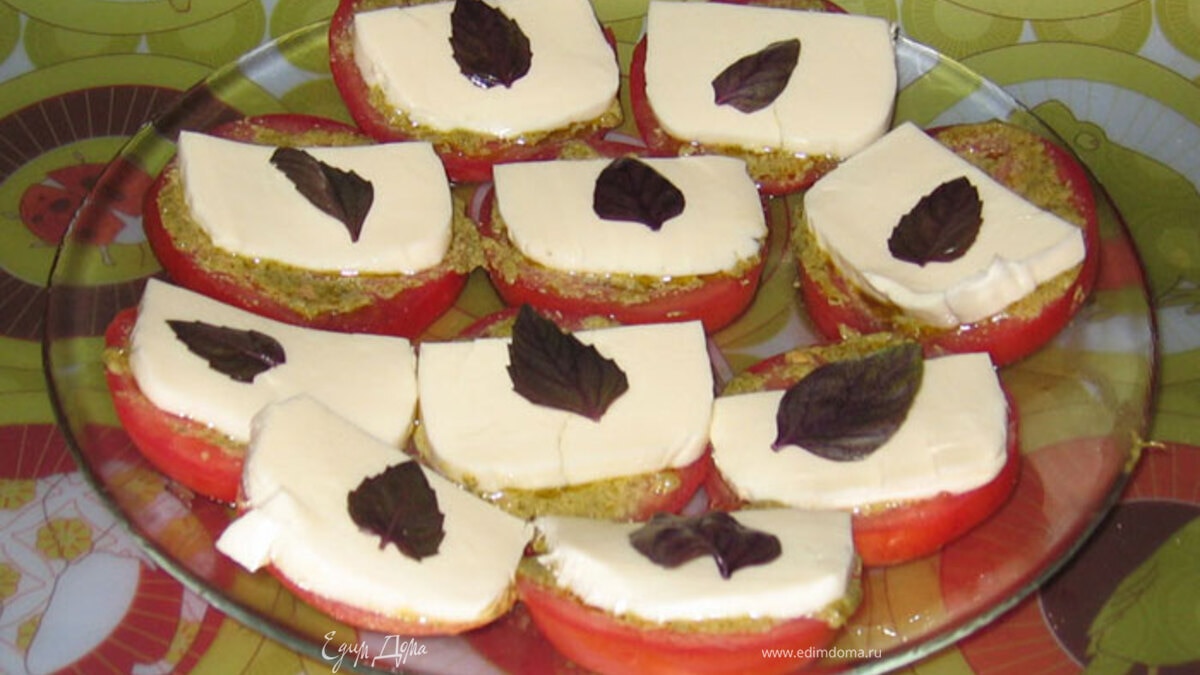 - Шаг 1На помидор намазать песто, сверху положить сыр и украсить листиком базилика.