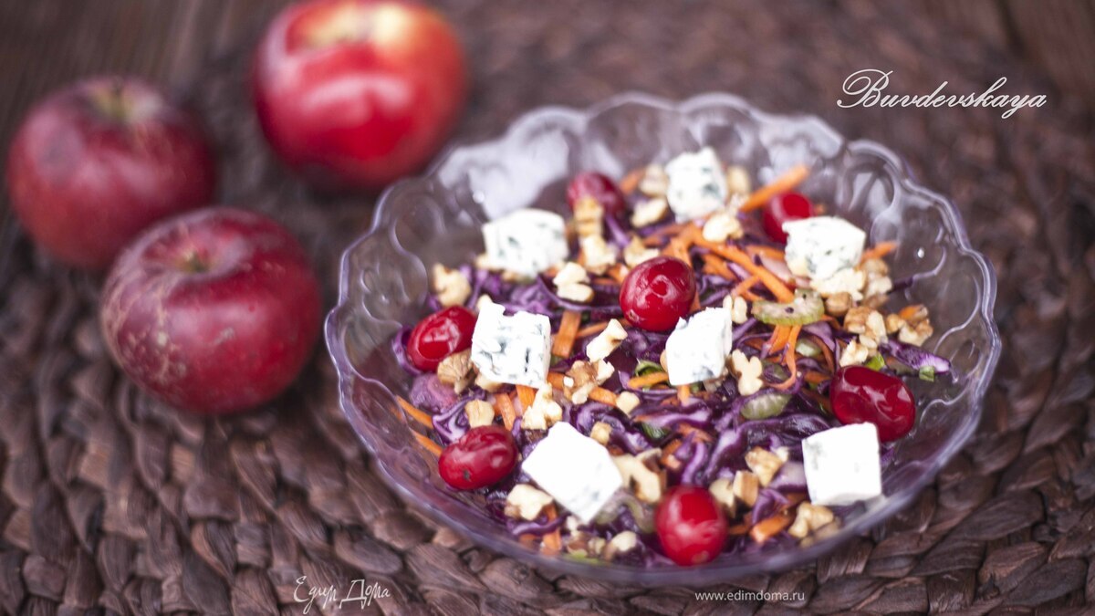 Салат из красной капусты с яблоками, голубым сыром и клюквой