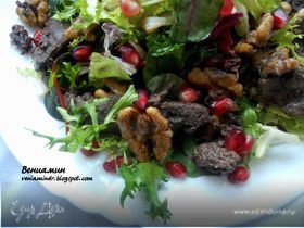 Нежная печенка, хрустящие листья салата, пикантная заправка и мягкие сладкие орешки. Так просто, но так интересно на ощупь)))