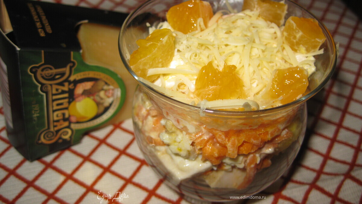 Очень вкусный, легкий и красивый салатик. Озорство этого «цыпленка» заключается в сочетании курицы с морковкой пряной плюс потертым сыром Джюгас и измельченными куриными яйцами. Для праздничного стола я делаю его в порционные стеклянные фужеры.