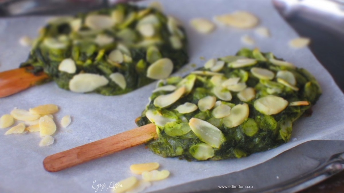 В чаше миксера соединить салат латук, шпинат, морковь, картофель и измельчить массу. Добавить сыр, яичный желток, посолить и хорошо перемешать. Столовой ложкой взять овощную массу, сформировать "эскимо", вставить деревянные палочки, обвалять в миндальных хлопьях и выложить на противень с пергаментом. - Шаг 5