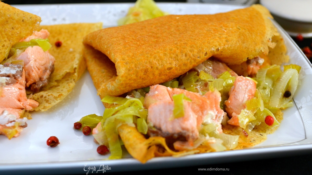 Блинчики с начинкой из семги и лука порея