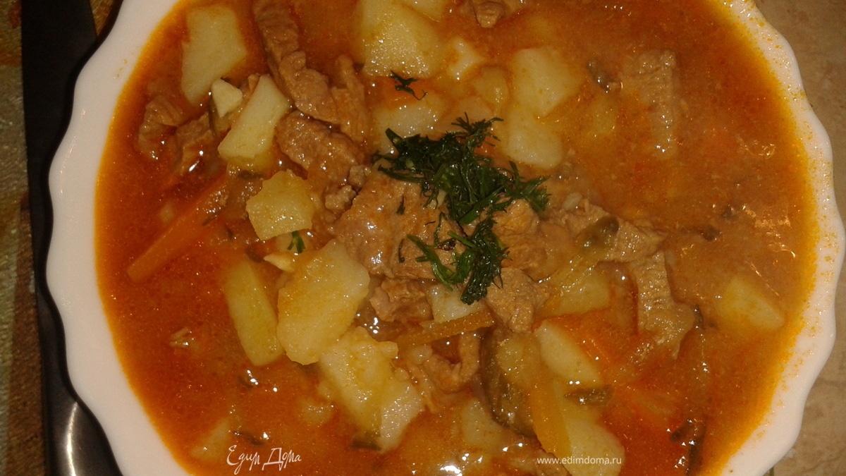 Тушить под крышкой до готовности мяса, затем добавить картофель, воды, соли, перца, лаврового листа и пропущенного через чесноковыжималку чеснока.