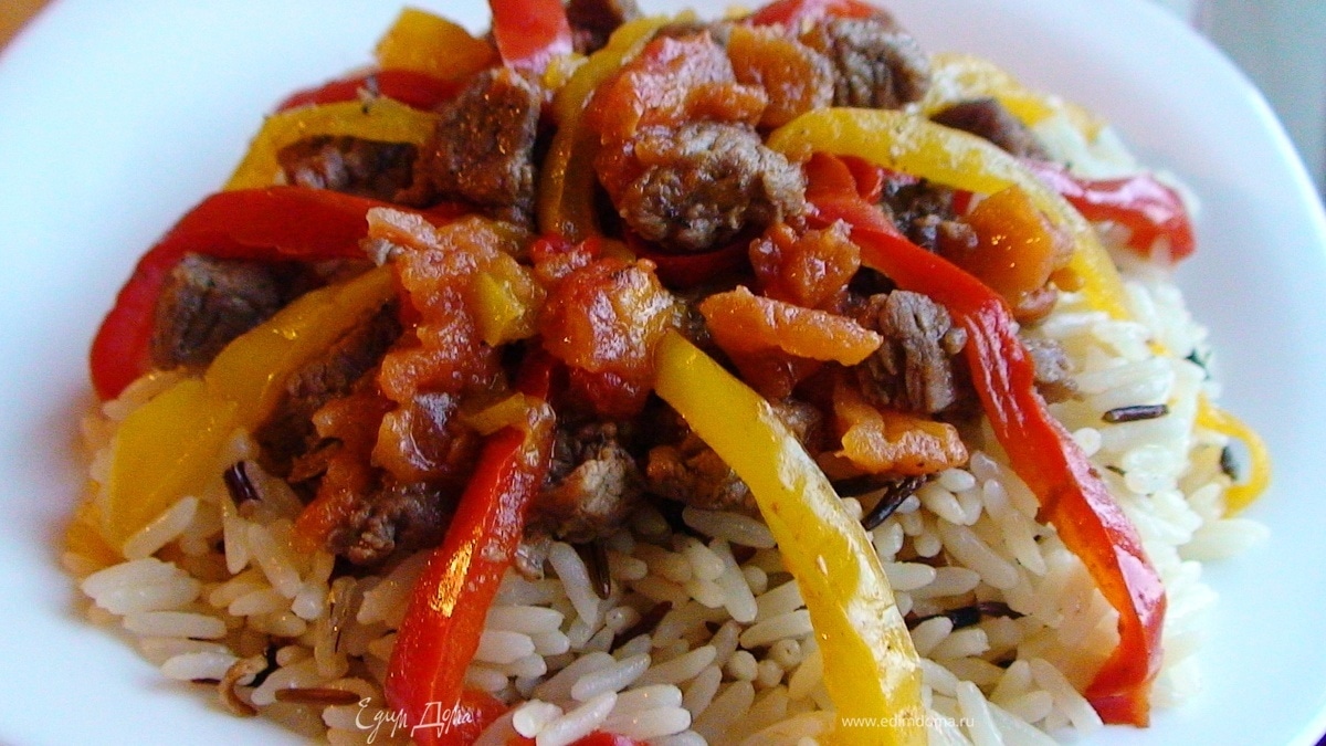 Рис отварить отдельно в подсоленной воде до готовности. Подавать рис, сверху выложив мясное рагу с овощами.