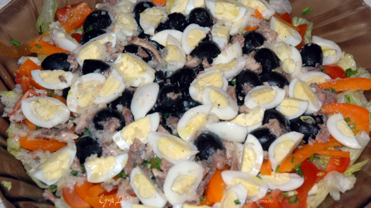 Классический французский салат. В традиционной «Ницце» должны обязательно присутствовать анчоусы, маслины, ломтики яиц, сладкий перец, томаты и зеленый салат. На юге Франции эту смесь заправляют соусом из оливкового масла, чеснока и лимонного сока. Обычные помидоры можно заменить черри, куриные яйца – перепелиными. Также существует вариант салата с тунцом.