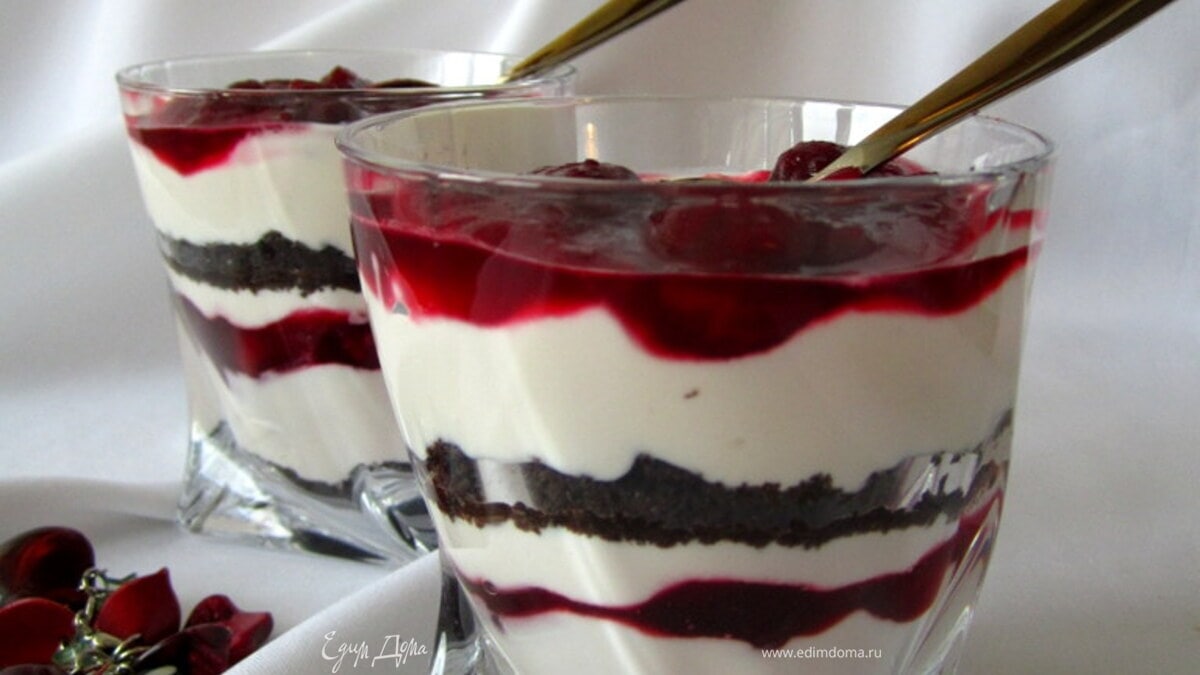 Десерт по мотивам всем известного торта "Черный лес". Готовится очень просто и при этом получается нежнейший и вкуснейший десерт! По желанию в рецепте вместо детских творожников можно использовать любой кремообразный творог, например филадельфию или маскарпоне.