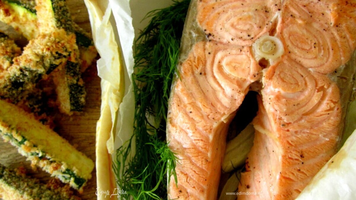 Семга, запеченная в конверте, и цукини в панировке