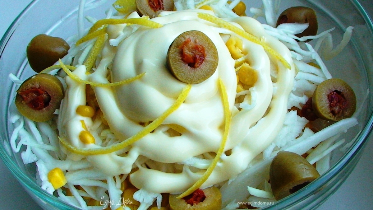 Соединить все ингредиенты (кроме цедры лимона), посолить, перемешать и заправить салат. Украсить цедрой лимона.