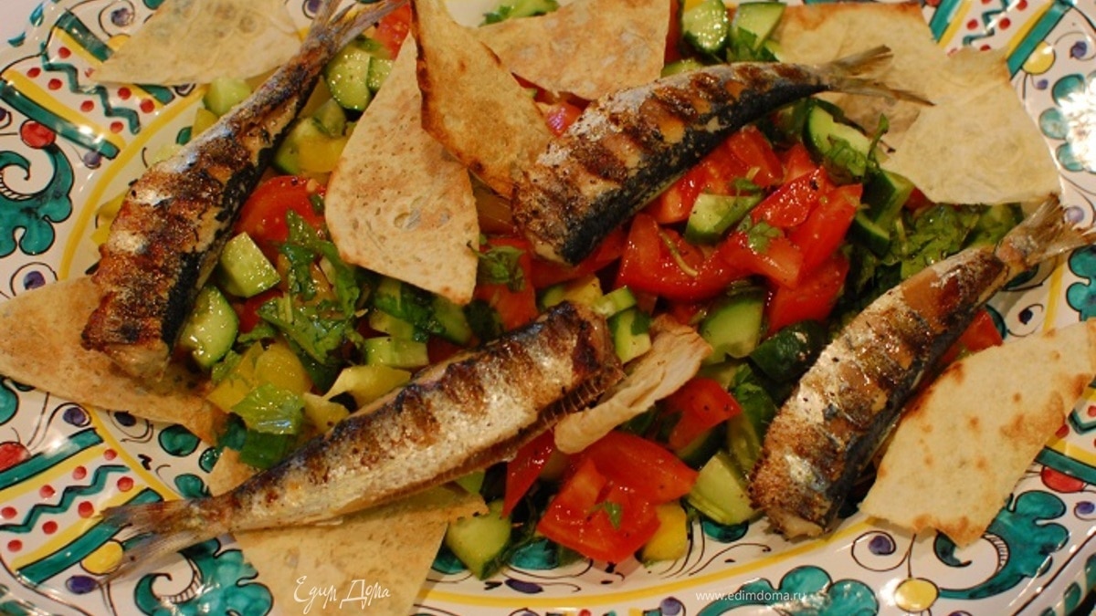 Сардинки с легким салатом и чипсами из лаваша