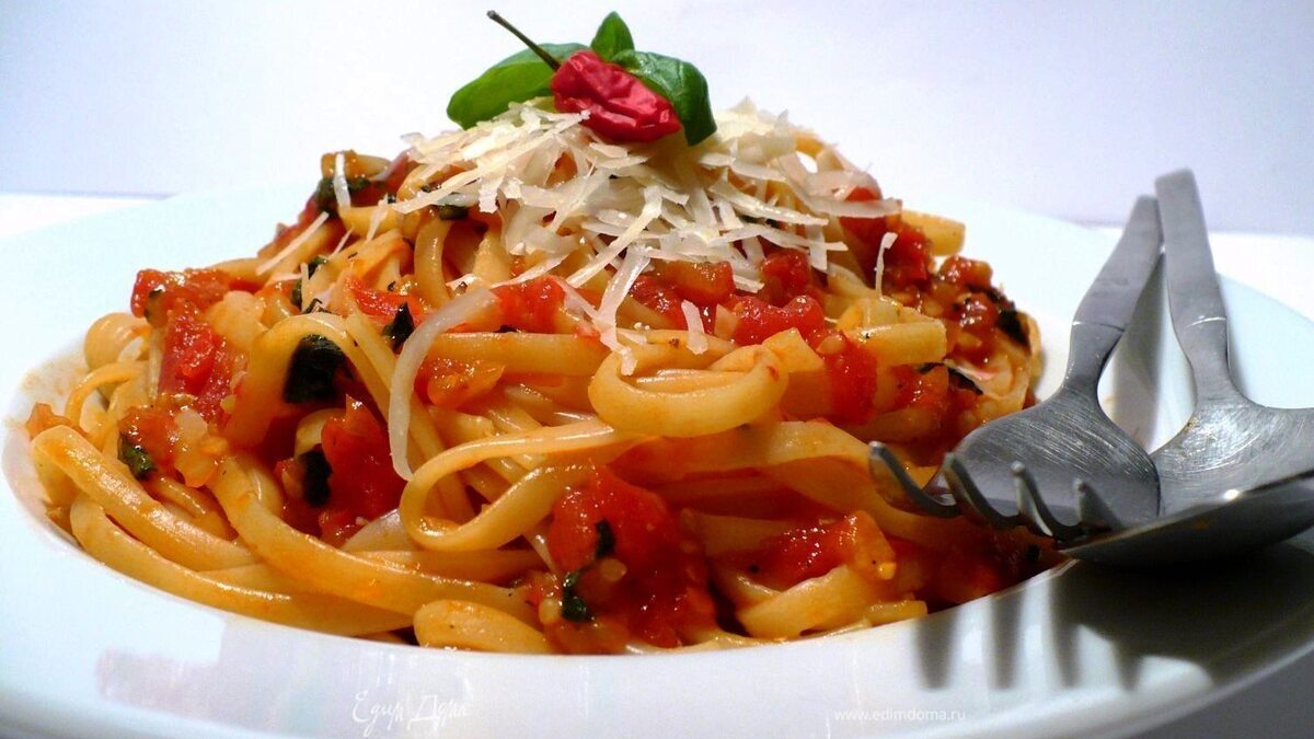 - Шаг 5Заключительным шагом выкладываем соус на пасту, украшаем мелко нарубленным базиликом и тёртым пармезаном. Смею заметить, в данном блюде гармонично сочетается острота чили и сладость мёда! Томаты лают приятную кислинку, гималайская соль уже одним свои присутствием делает блюдо достойным украсить даже праздничный стол. Ну, а качественная паста не нуждается в комментариях! Приятного итальянского аппетита с Джейми Оливером!