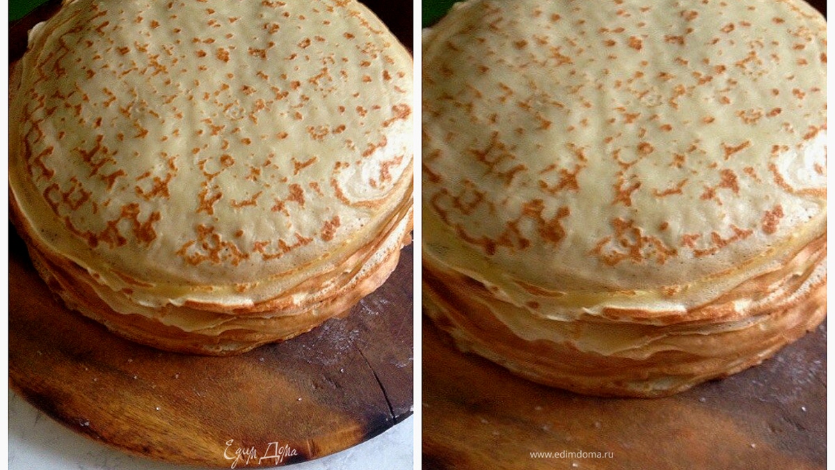 После этого разбавляем молоком тесто, смотрим по консистенции. Если молоко домашнее, жирное - разбавляем водой 125 мл. На раскаленной сковородке пожарить тонкие блины! Приятного аппетита!