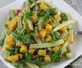 Очень вкусный и сытный салат с осенними продуктами)) первый раз попробовала такой соус песто - он просто потрясающе вкусный и ароматный) рекомендую) готовить его лучше сразу перед подачей, так как со временем он имеет свойство темнеть. С тыквой получается отлично, но также сюда хорошо подходит сладкий картофель. Попробуйте и Вы))