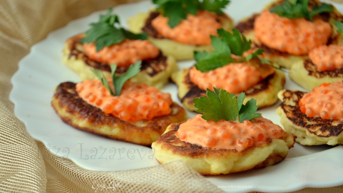 Разогреть на большой сковороде оливковое масло и обжарить с обеих сторон картофельные блинчики.