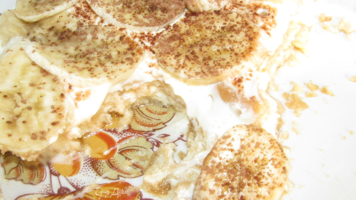 Взять форму, желательно квадратную. Приготовить желатин и соединить его с йогуртом. - Шаг 1Слоями выложить печенье и йогурт, чередуя один за другим. После 3 слоя выложить нарезанный банан, дальше продолжать. Сверху украсить бананами и потрусить через сито какао-порошок! Поставить в холодильник на 2,5 часа. Приятного аппетита!!!!