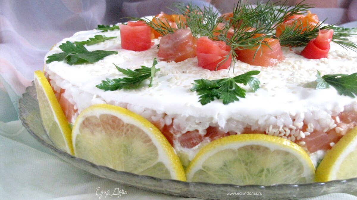 Смазать верх торта оставшимся сливочно-сырным кремом. Украсить по своему желанию. Я украсила дольками лимона, розочками из семги и имбиря, зеленью петрушки, укропа, кунжутом. - Шаг 10