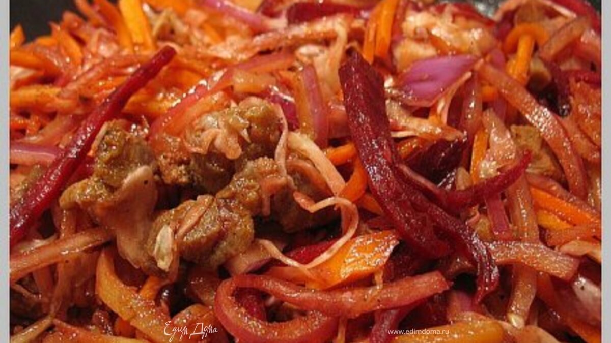 1Очень вкусный салат, мой муж его просто обожает, правда я делаю его немного по-другому: капусту в свежем виде шинкую тоненькими полосками, свеклу и морковь обвариваю в кипятке, буквально минут 5-6. Потом их натираю на терке для корейской моркови, они получаются как спагетти. Мясо обжариваю тоже тоненькими полосочками, а-ля беф строганов. Картофель на той же терке и обжариваю практически по отдельности каждую соломинку. Потом все это дело укладываю на тарелку горстями по кругу, а в серединку майонез
