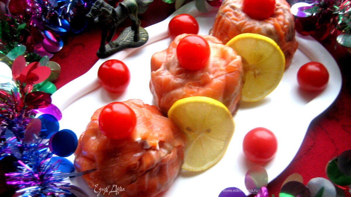 Выстилаем каждую ячейку (всего хватило на 3 крупных ячеек размером с апельсин!) полосками рыбки... - Шаг 13