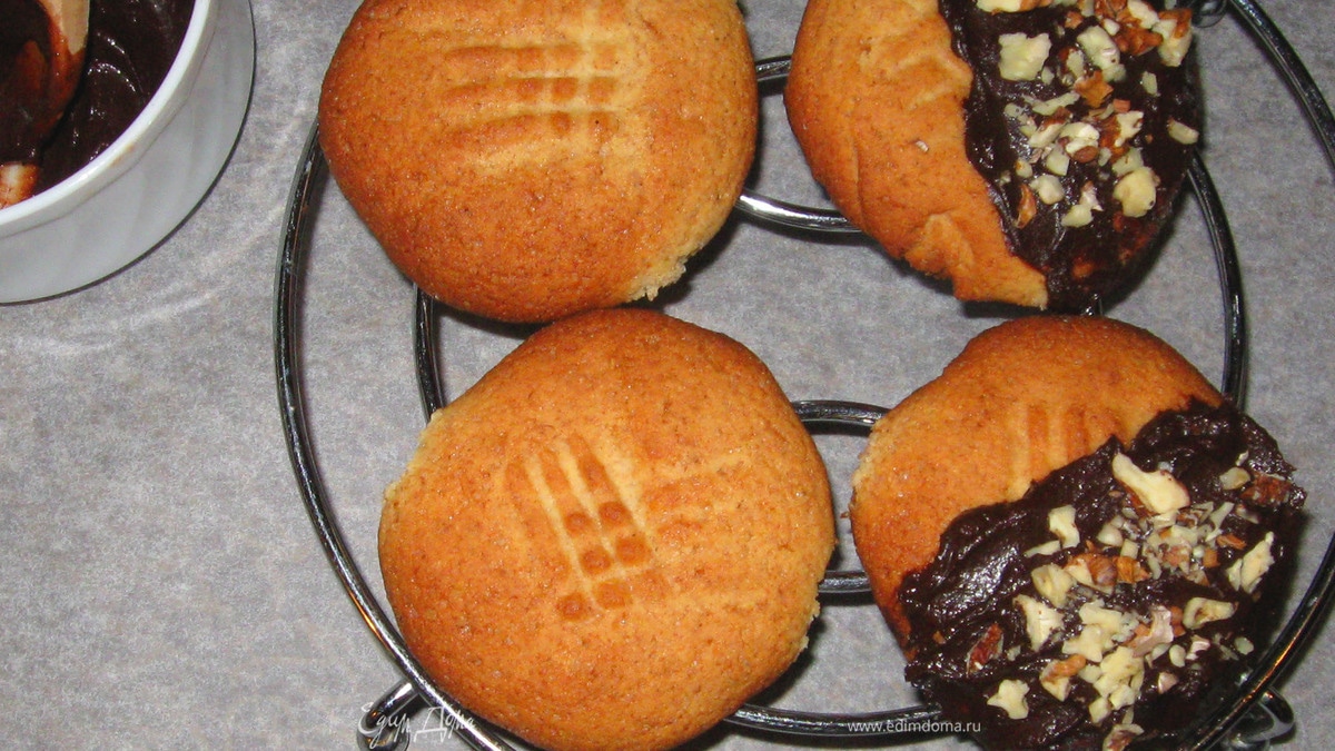 Половинку каждого печенья обмакнуть в растопленный шоколад и посыпать орехами.