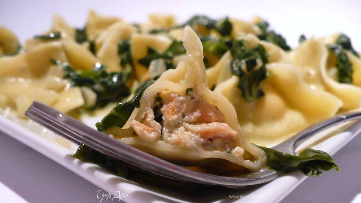 Закрытые макароны с начинкой из сливочного копченого лосося под сливочно-винным соусом со шпинатом