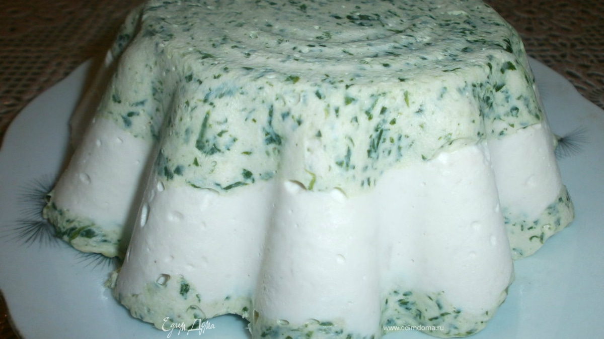- Шаг 4Соединить желатиновую смесь с курино-творожной. Затем 2/3 этой массы смешать со шпинатом.