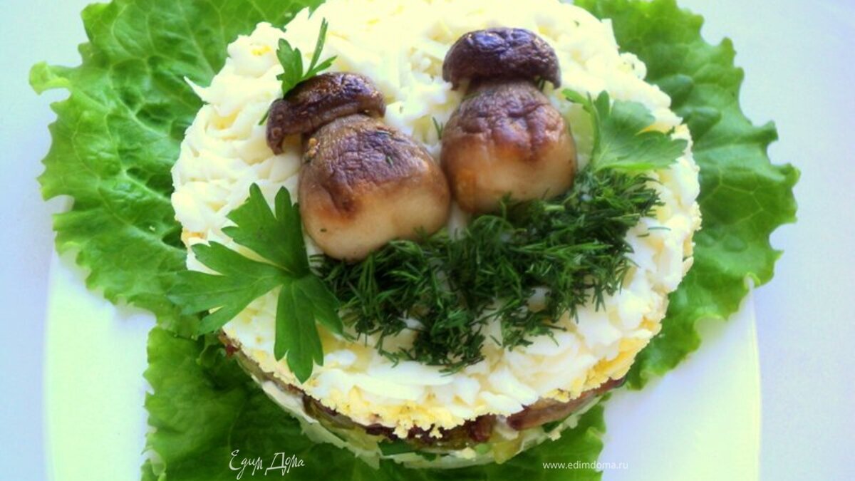 Снять кольцо. Украсить салат половинками белого гриба, укропом и петрушкой. Приятного аппетита!