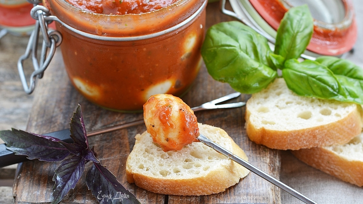 - Шаг 1Помидоры в соку раздавить вилкой,сложить в сотейник. Добавить травы, измельченный чеснок, соль и перец по вкусу, прогореть до кипения.