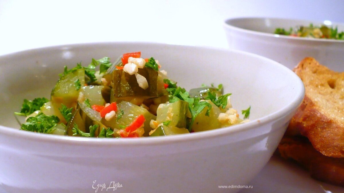 Подавать огурцы, посыпав свежей петрушкой и хлебом.