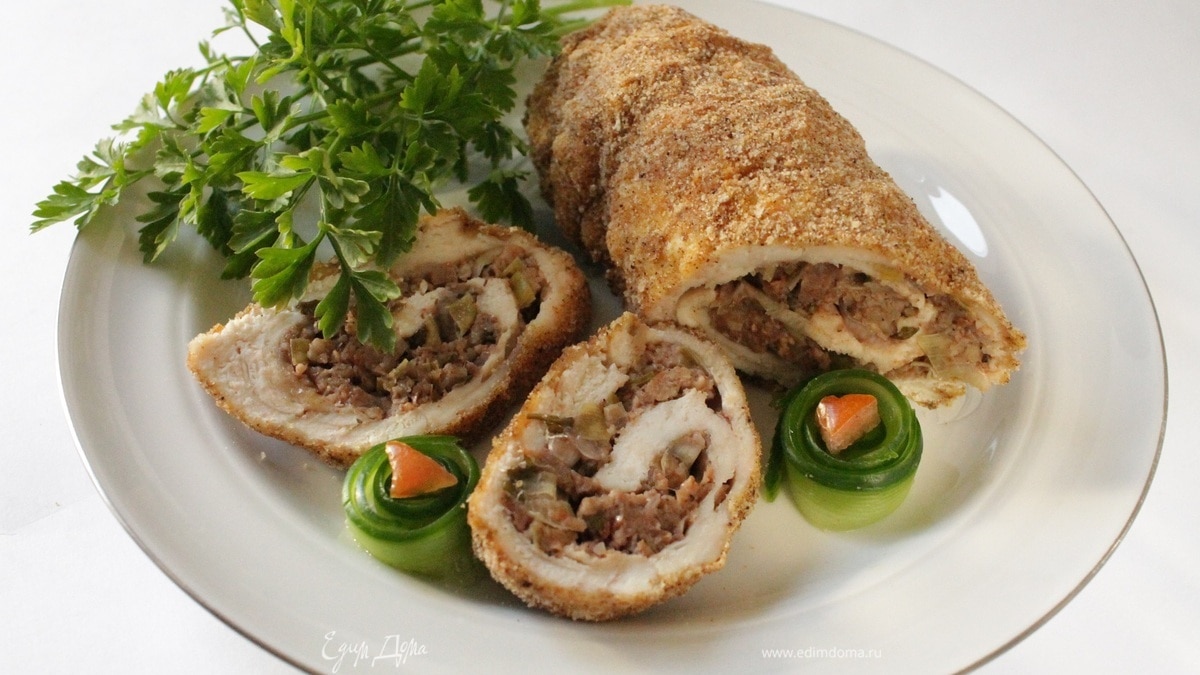 Очень вкусные рулетики из куриной грудки с начинкой из грецкого ореха и сушеных яблок, с добавлением лука порея, зелени, специй. Вкус и аромат начинки придает блюду пикантный вкус, благодаря панировке мясо получается