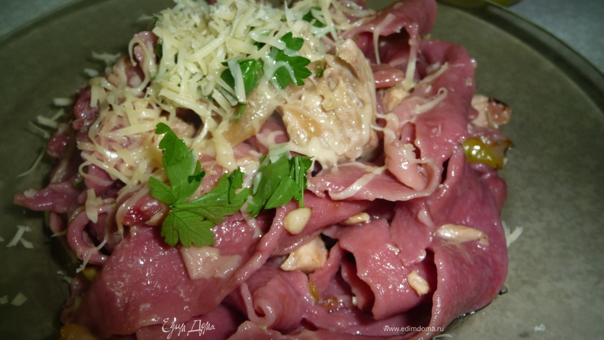 Розовые лазаньетти с курино-грушевым соусом