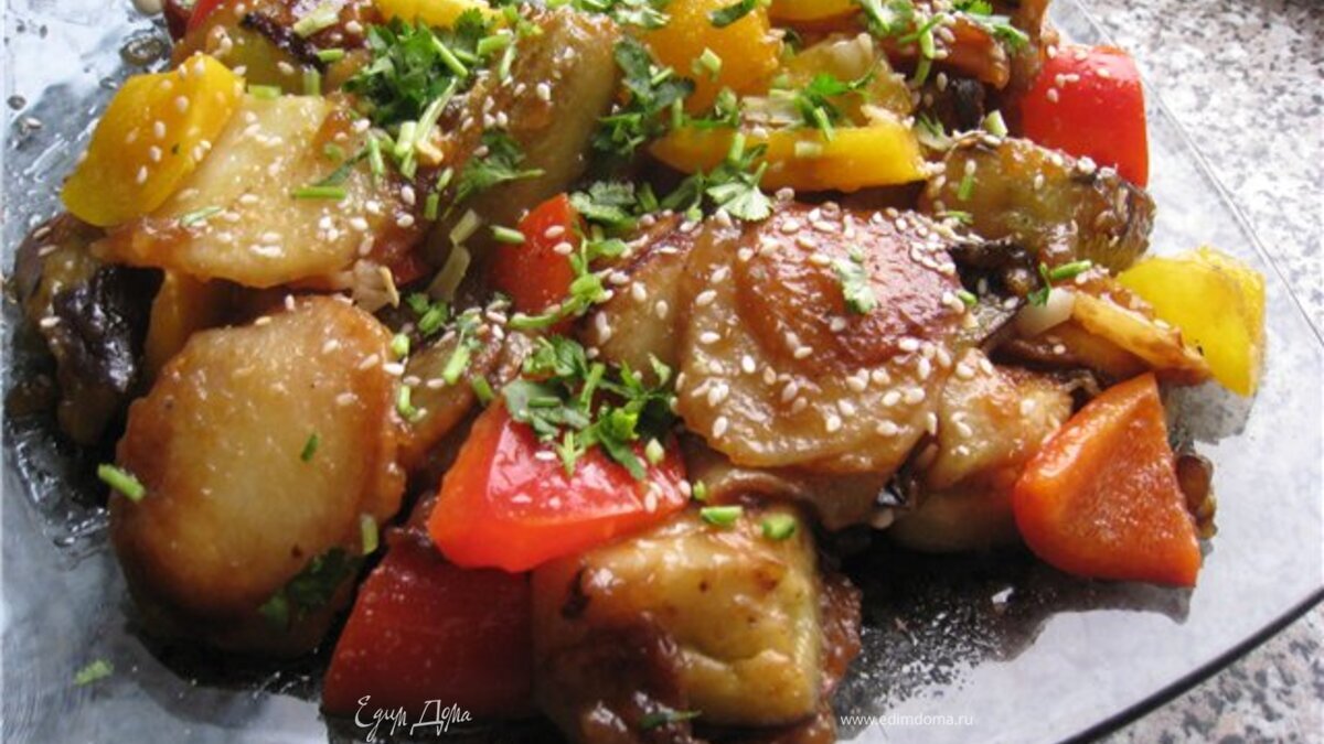 - Шаг 11) Баклажаны чистим, режем очень крупными брусками - 1 крупный баклажан на 6-8 частей, картофель кружочками, перец квадратиками 2х2 см. Крахмал разводим в 3/4 стакана воды. 2) Обжариваем на масле картофель до хрустящей корочки, выкладываем на блюдо, убираем в сторону. Обжариваем на этом же масле баклажаны.Когда баклажаны станут мягкими добавляем обжаренный картофель, соевый соус, если надо досаливаем (соевый соус соленый!), выливаем разведенный крахмал, тщательно помешиваем. Как только крахмальный соус станет тягучим и прозрачным, плиту выключаем, добавляем чеснок и зеленый перец.
