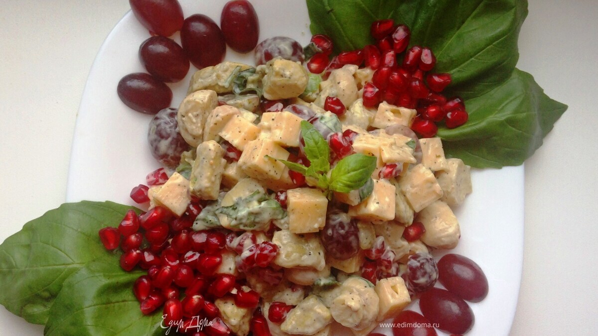 Соединить курицу, грибы, сыр, виноград, базилик, добавить зерна граната, выдавить 2 зубчика чеснока, поперчить и заправить майонезом.