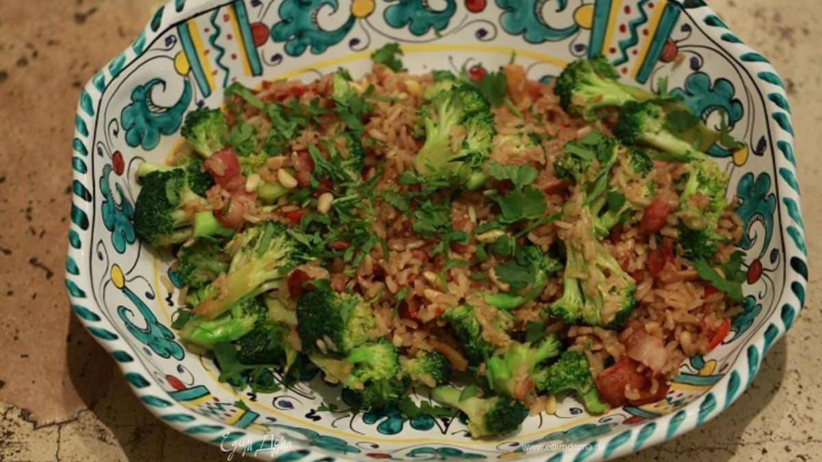 Теплый салат из бурого риса с брокколи и беконом