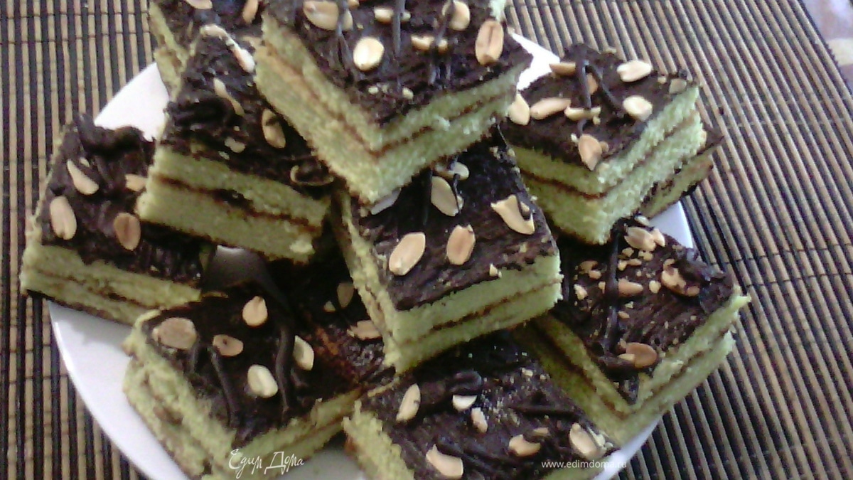 - Шаг 1Остывший бисквит разрезать пополам и смазать повидлом (сверху я кладу досочку и ставлю сверху литровую банку с водой, чтобы они приклеились друг к другу), а потом сверху полить растопленным шоколадом и посыпать поджаренным арахисом.
