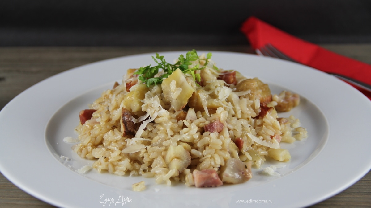 Очень вкусное и ароматное ризотто) рис так замечательно пропитывается копченым вкусом грудинки, к нему хорошо подходят сладковатые каштаны и солоноватый пармезан)) сытное и питательне блюдо, идеально для холодного времени года)
