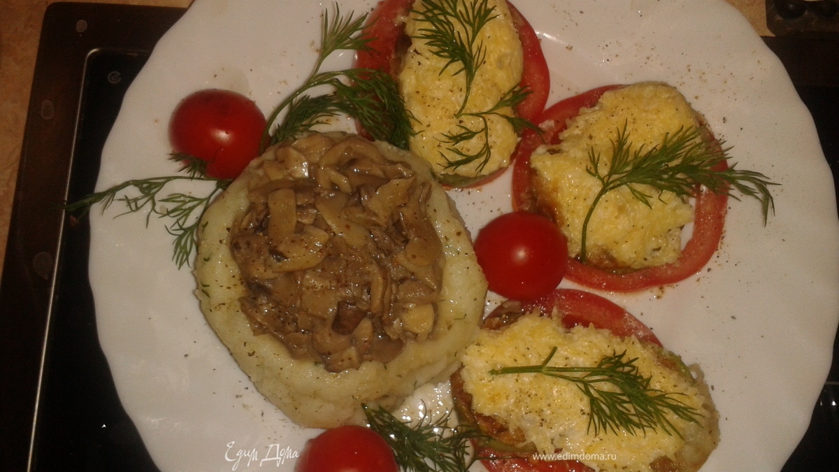 На помидор выложить кабачок, сверху майонез с сыром, из картофельного пюре сделайте горочку, сверху надавите ложкой и сформируйте небольшую ямку, в которую и добавьте грибы.