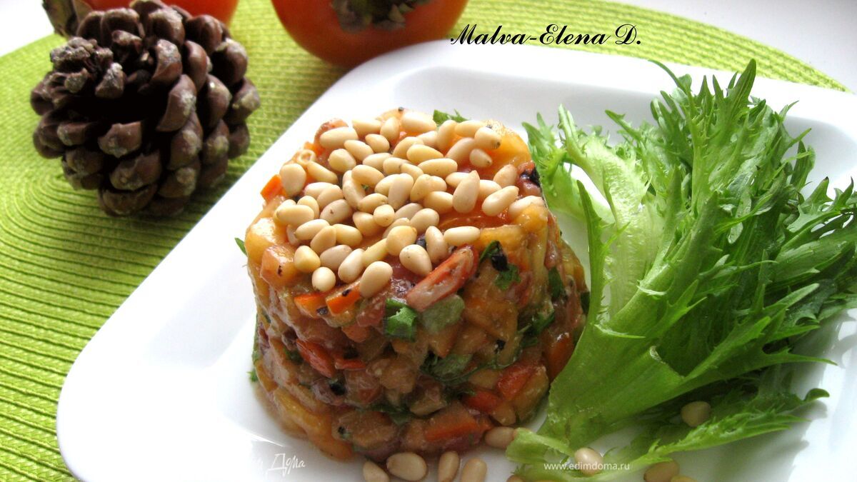 Оформить с помощью кольца, посыпать сверху орешками, украсить листиками фриллиса. Приятного аппетита!