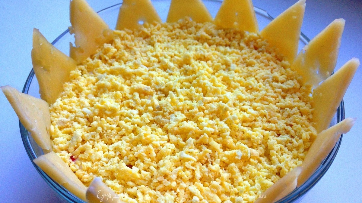 Выкладывать салат слоями, каждый (кроме лука) смазывая майонезом: 1) печень, 2) лук, 3) кукуруза, 4) крабовые палочки, 5) сыр 6) белки 7) желтки (я выкладывала под трафарет - картинку, распечатанную из интернета). Украсить корону по желанию. - Шаг 6