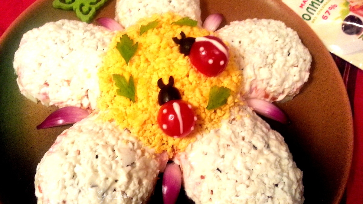 Выдавливаем на нож немного майонеза, закрашиваем пробелы на цветке, украшаем листиками зелени. - Шаг 20