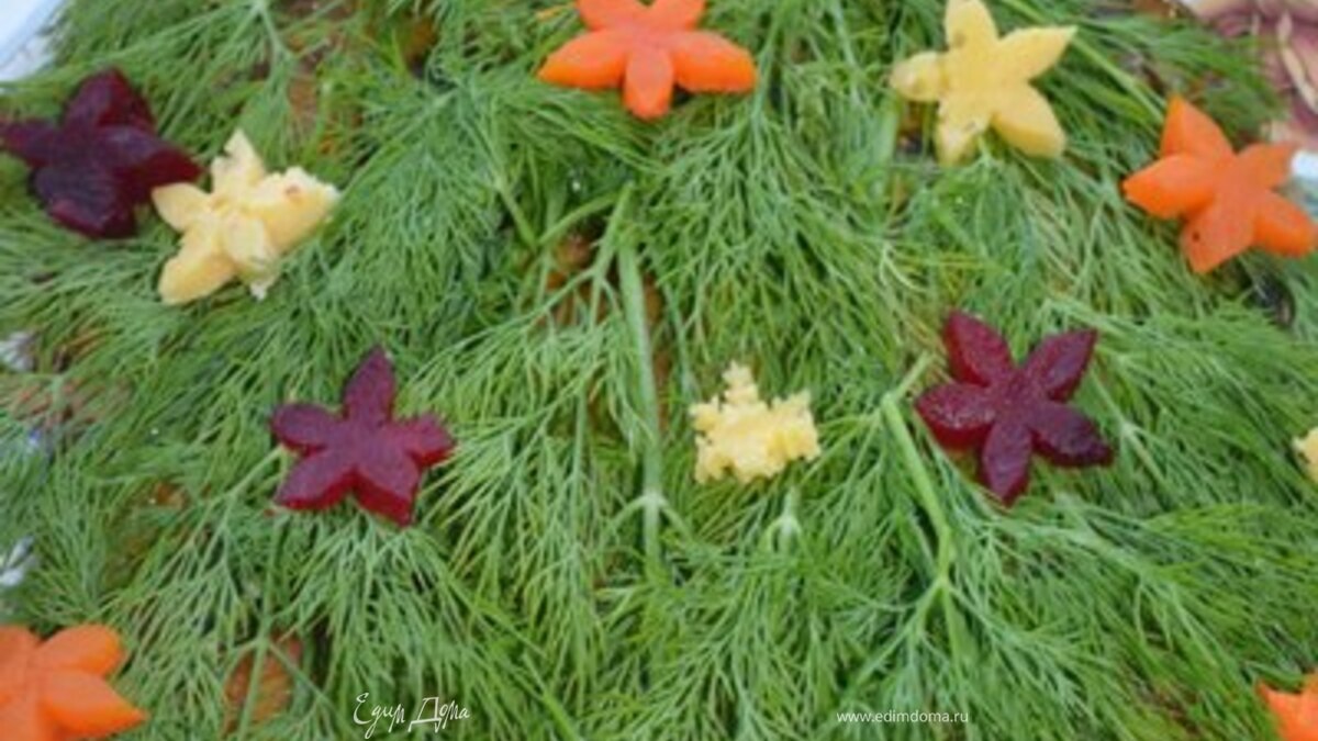 Вынимаем запеченную горбушу, перекладываем на блюдо, даем немного остыть. На рыбу выложить веточки укропа, по желанию украсить сыром, вареными морковью и свеклой. Счастливого Нового года 2014!