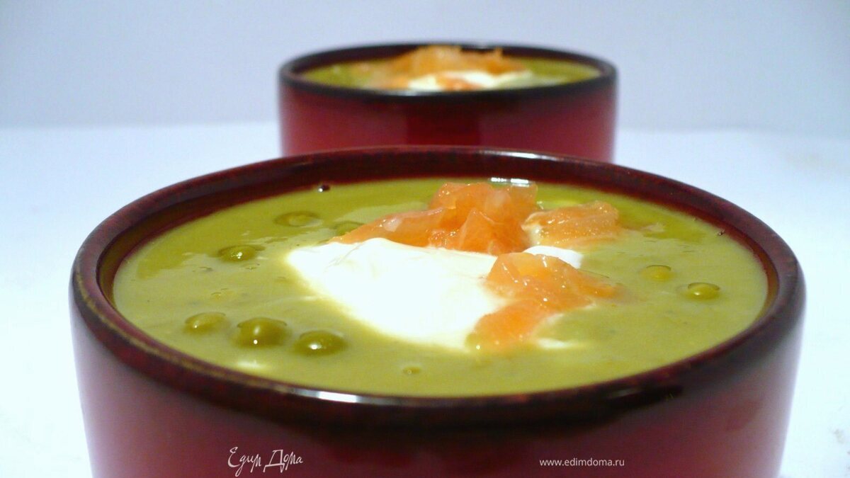 Закусочный гороховый суп с копченым лососем и шапочкой из крем-фреша