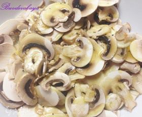 2. Шампиньоны помыть, обсушить и нарезать на тонкие ломтики. Можно воспользоваться слайсером. Затем выложить в глубокую миску, залить половиной заправки. Аккуратно перемешать и оставить мариноваться на 7-10 минут.