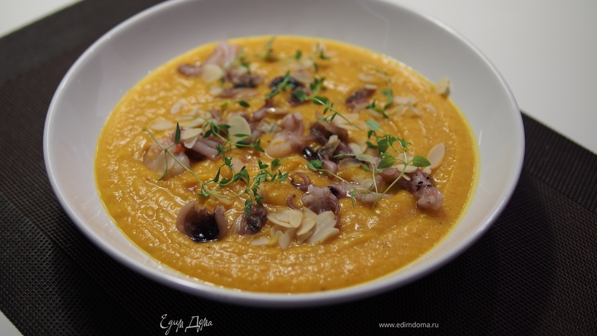 - Шаг 5При подаче добавить креветки или морепродукты. По желанию украсить лепестками миндаля или тыквенными семечками. Приятного аппетита!