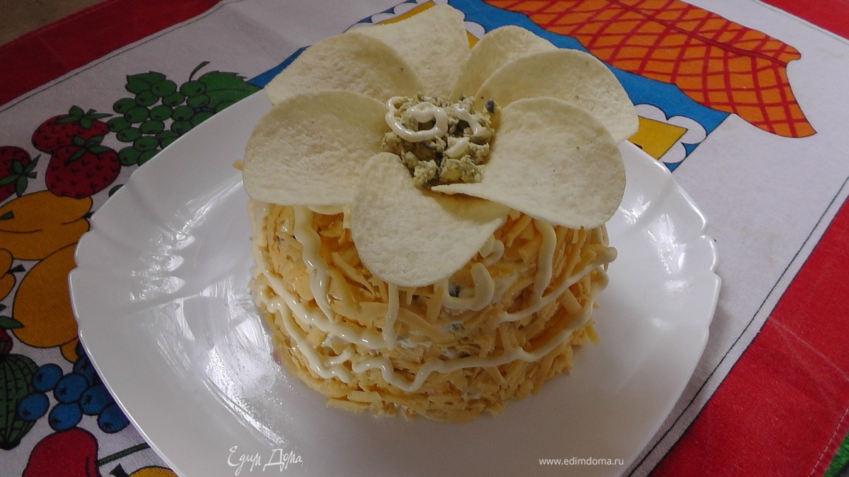 - Шаг 11Украшение: чипсы 1 желток немного майонеза Украсить дорожками из майонеза, а сверху из чипсов выложить цветок, а в серединку измельченный желток и немного майонеза