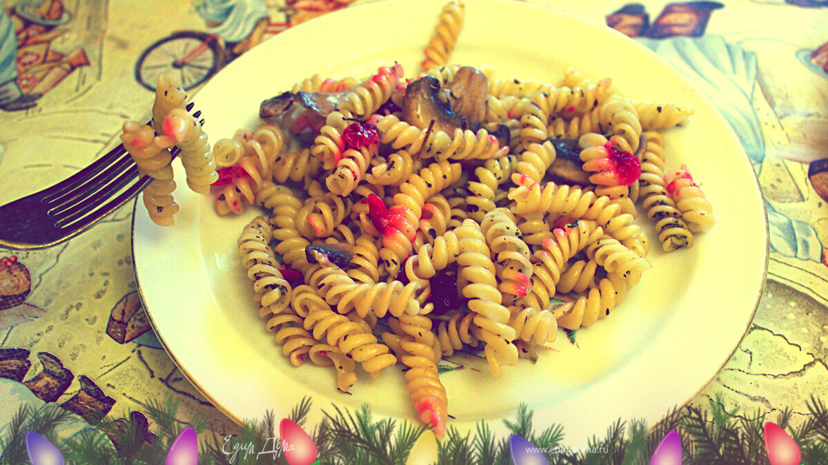 - Шаг 3Добавить к отваренным макаронным изделиям грибы и ягоды. Еще раз посыпать итальянскими травами! Приятного аппетита!