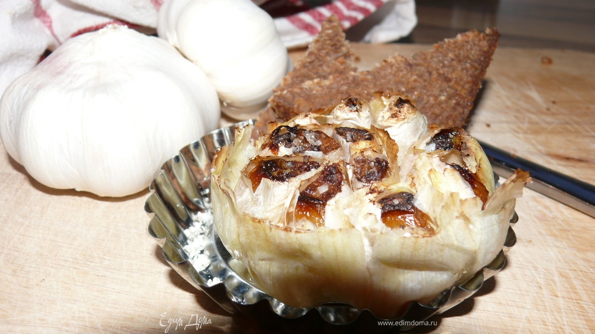 - Шаг 11.С целой головки чеснока срезать верхушку( где должны бы быть ростки)примерно 1 см. 2.Посолить, полить оливковым маслом . 3. В форме ддя запекания( я брала для формочку для кексов) поставить в разогретую духовку 200-225 гр. на 30 минут. 4. Подать с тостами, подсушенными хлебцами или кусочками багета.